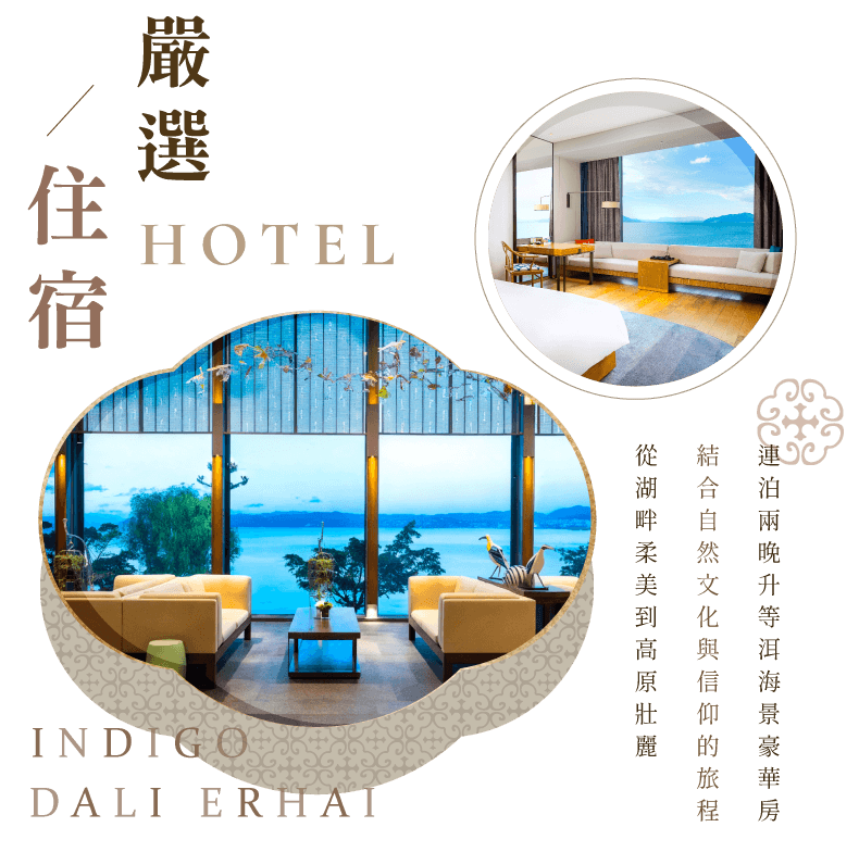 - 如遇大理英迪格酒店滿房,則改入住大理俊發鉑爾曼酒店五星或大理實力希爾頓酒店五星,每人每晚退還房差NT.1100元。