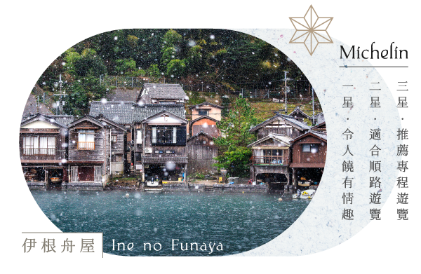 米其林指南美景:在「海の京都」與「森の京都」間,散落著數處米其林指南推薦的景點,如畫卷般展開的天橋立(★★★),靜倚水岸的伊根舟屋(★★),以及懷舊氛圍濃厚的城崎温泉(★★)。這些絕美景點不僅值得一訪,更適合放慢腳步,細細品味其交織的歷史、文化與自然之美。