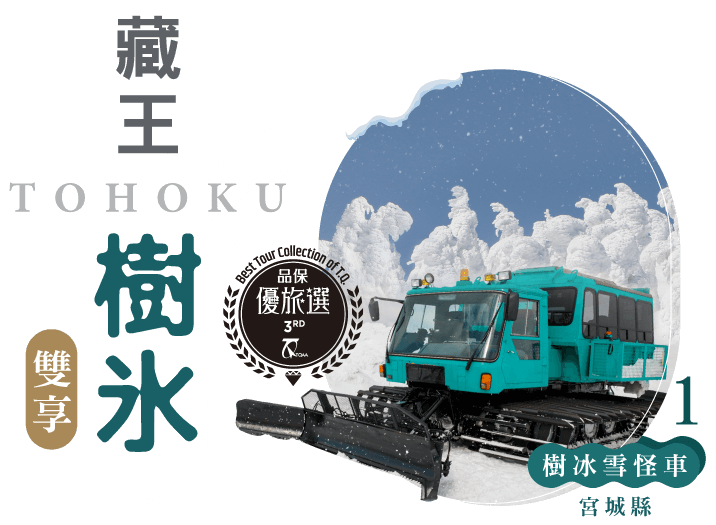 (期間限定:參考2024/12/21-2025/03/09)。樹冰雪怪車Snow Monster,深入宮城藏王樹冰,下車戲雪、樹冰近在咫尺。雪怪車車位有限-操作難度高,敬請把握難得機會。