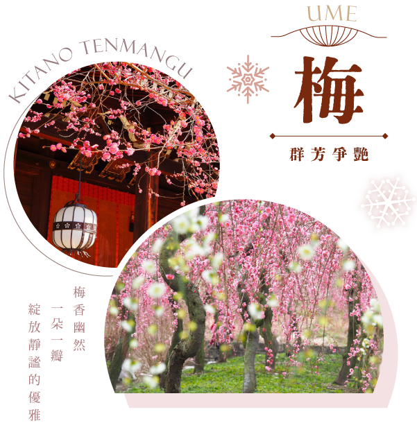 京都北野天滿宮梅苑「京都梅花第一」:1000本以上,臘梅(約2月上旬)與梅花(約2月下旬-3月中旬),紅白相爭相鬥艷。