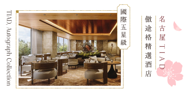名古屋TIAD傲途格精選酒店:萬豪集團Autograph Collection旗下極具設計感與現代奢華風格的精品酒店。「TIAD」,用綠意與木材打造自然輕奢氛圍,寬敞客房,位在名古屋市屋久大通旁,房內就能一覽屋久大通公園、電視塔!
