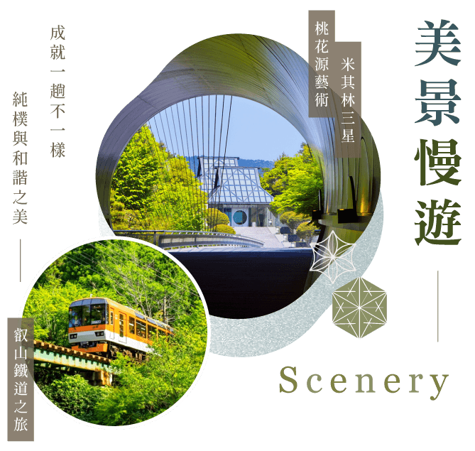 - 景點料金:叡山鐵道之旅¥ 1,200、比叡山花園美術館¥ 1,200、地元旬彩御膳¥ 3,500,已含在團費中。