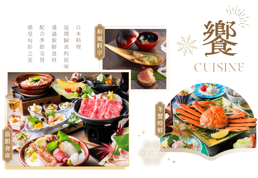 早餐: 飯店內享用早餐 午餐: 旬彩和韻創作 或 時旬洋食料理 晚餐: 點心:美山點燈屋台.發放代金¥1,000 冬旬蟹宴會席料理 或 主廚百匯料理