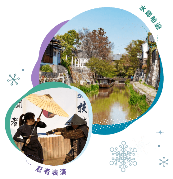 近江八幡堀.水鄉船遊 ~季節限定:農家樂.採草莓(12月下~5月初) ~藝術美學:【A. 「主題樂園3」伊賀流忍者博物館.手裡劍忍者秀 或 B. 御在所岳.銀花樹冰.空中纜車】~F1夢幻賽道.鈴鹿賽車場主題酒店