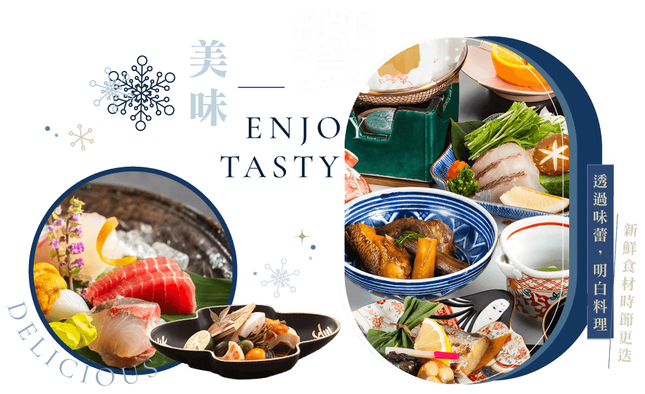 早餐: 飯店內享用早餐 午餐: 異國創意套餐 或 季節時旬御膳 晚餐: 主廚四季創作料理 或 飯店內主廚百匯自助料理