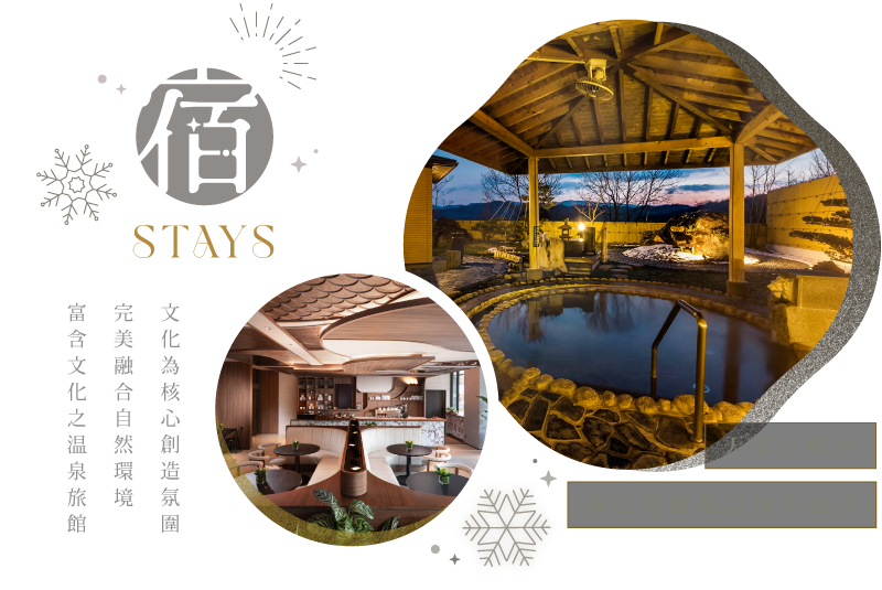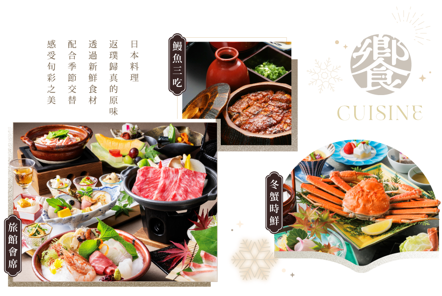 早餐: 飯店內享用早餐 午餐: 旬彩和韻創作 或 時旬洋食料理 晚餐: (美山點燈屋台: 發放代金¥1000) 秋旬蟹宴會席料理 或 主廚百匯料理