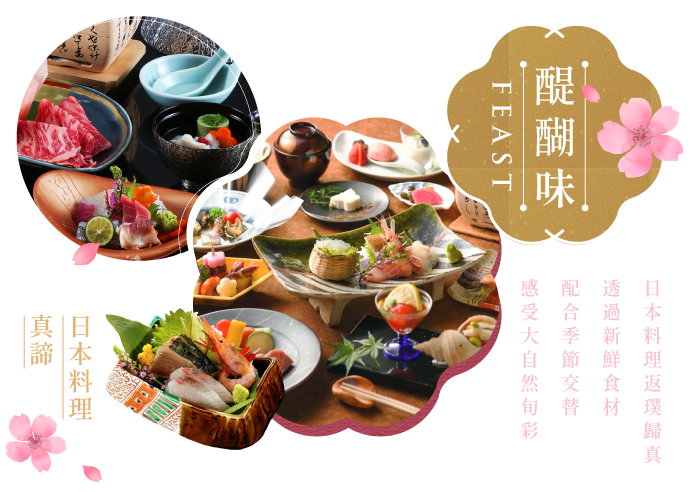 聽著風吹過山川草木聲音,看著窗外春櫻、夏綠、楓紅、雪舞;「款待的心」結合「和韻之美」,今晚,代表溫泉旅館的會席晚宴,就從第一品料理開始上演,邀請您親自細細品宴。