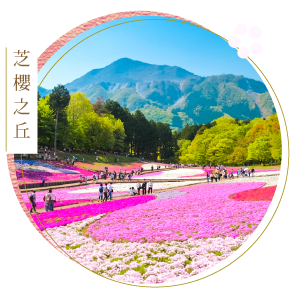 芝櫻之丘占地廣大,超過40萬株芝櫻覆蓋整座山丘,彷彿是由紅、粉、白、紫等多彩的地毯拼接而成。從山下或山上俯瞰,與遠山相映,壯闊景色浪漫至極。