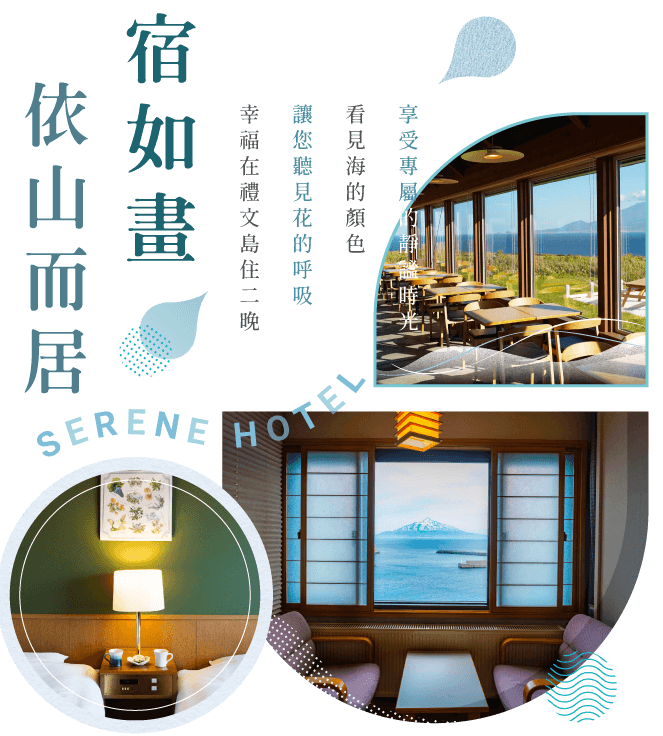 幸福在北海道.禮文島住二晚:當您走進旅館那刻起,落入眼前的落地窗,成了裝裱時間的畫框,白雲碧海藍天交織,在您眼眸中優雅起伏,而您的心已在與自然對話中,找到了久違的寧靜。
