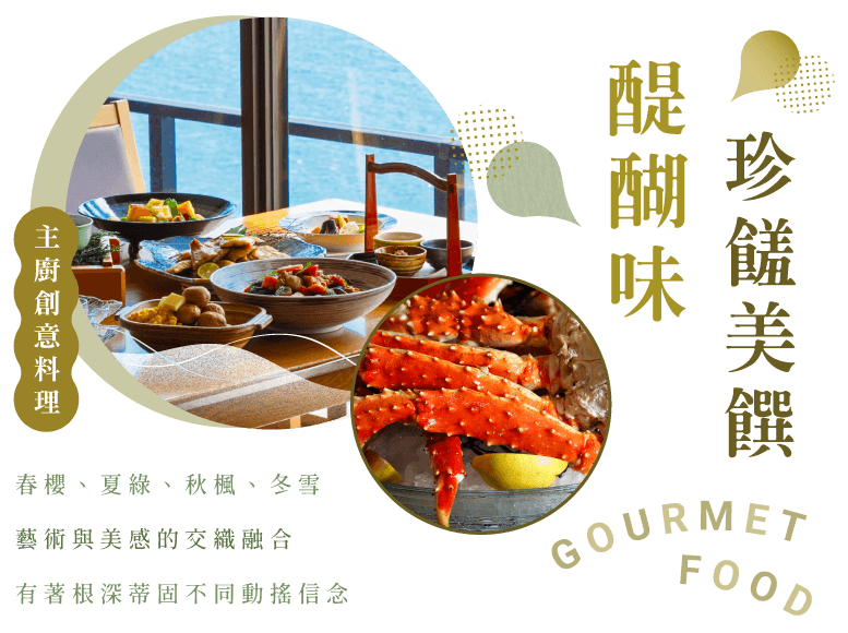 「蟹宴」特色餐:北海道代表美食-螃蟹,來自鄂霍克海流冰,嚴寒讓肉質更富彈性,成為饕客追逐最愛;以各式烹調端出「蟹宴」,一次品嘗多種蟹料理,鮮味與甜味在口中擴散,絕非「吃到飽」可比擬。