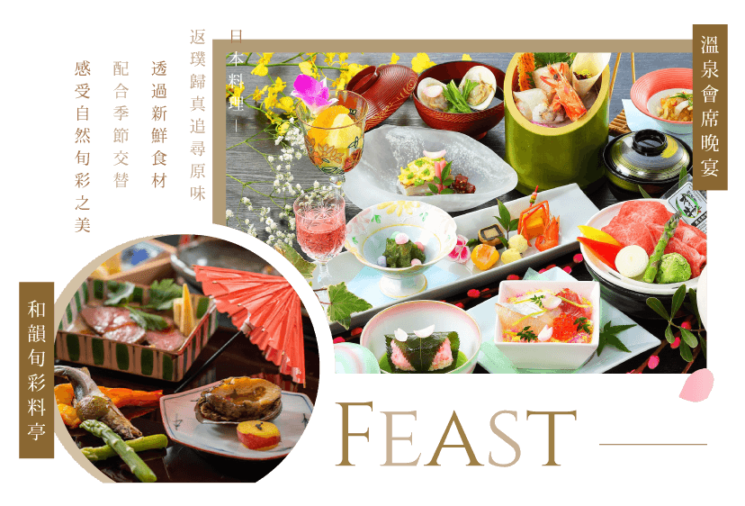 溫泉會席晚宴:五感之食藝,等著您用「心」品宴。「款待的心」結合大自然四季旬彩,細膩演繹「和」韻之美。