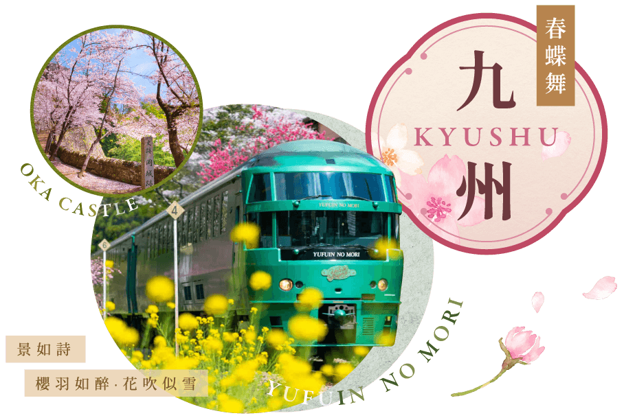 阿蘇舞春風.阿蘇神社.門前町商店街~ 九州小尼加拉瀑布.日本百選「原尻瀑布」 ~ 佐春光浪漫:【A. 櫻新點.枝垂櫻の里 或 B. 櫻百選.岡城跡】~ 醉心「湯布院」忘了時間