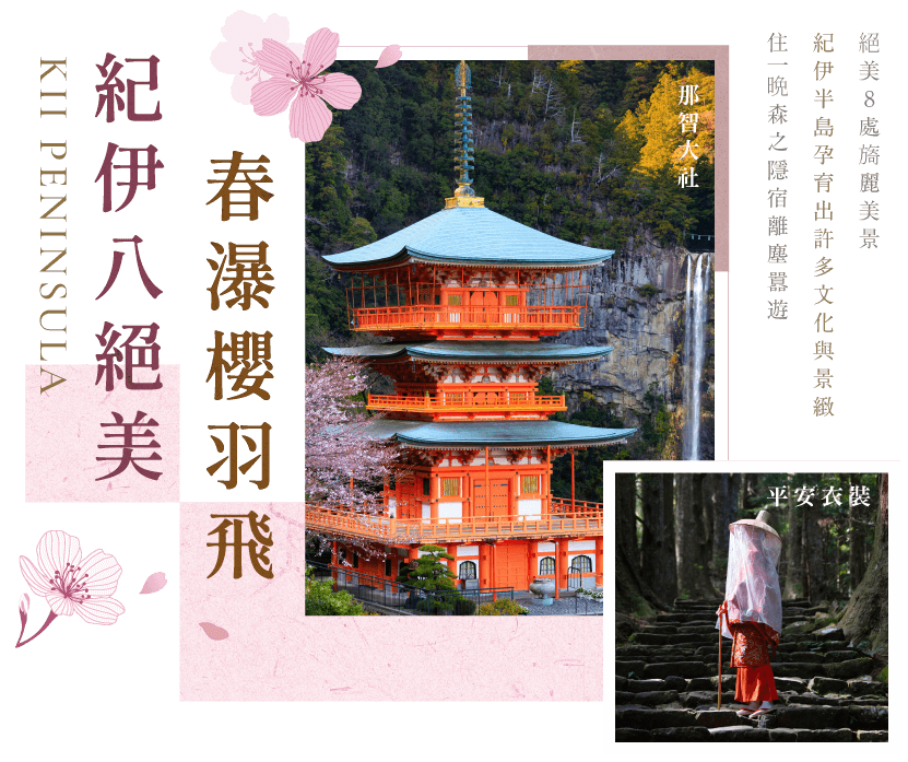 『熊野古道.平安衣裝著物體驗』 ~【米其林2星評鑑】-『絕美5』日本第一名瀧.那智瀑布(櫻花3月下旬4月上旬) ~熊野三山:青岸渡寺 + 那智大社(櫻花3月下旬4月上旬).世界文化遺產 ~『絕美6』南紀海濱:【A. 日本百景:橋杭岩.岩柱林立 或 B. 圓月島.夕陽無限好】 ~最古老三大名湯