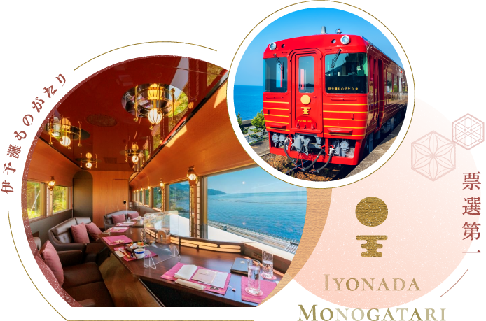 「伊予灘物語」以「茜色(夕陽色彩)」、「金黃色(太陽與橘子顏色)、私人包廂(陽華之章)」3節車廂構成,裡到外設計都別緻典雅,花紋布座椅與溫暖的木質地板有著居家般愜意氛圍,暖色系列車,眺望窗外山海,車裡車外皆美景,在地人士與車上貴賓互動,形成最美麗動人的一幅畫。