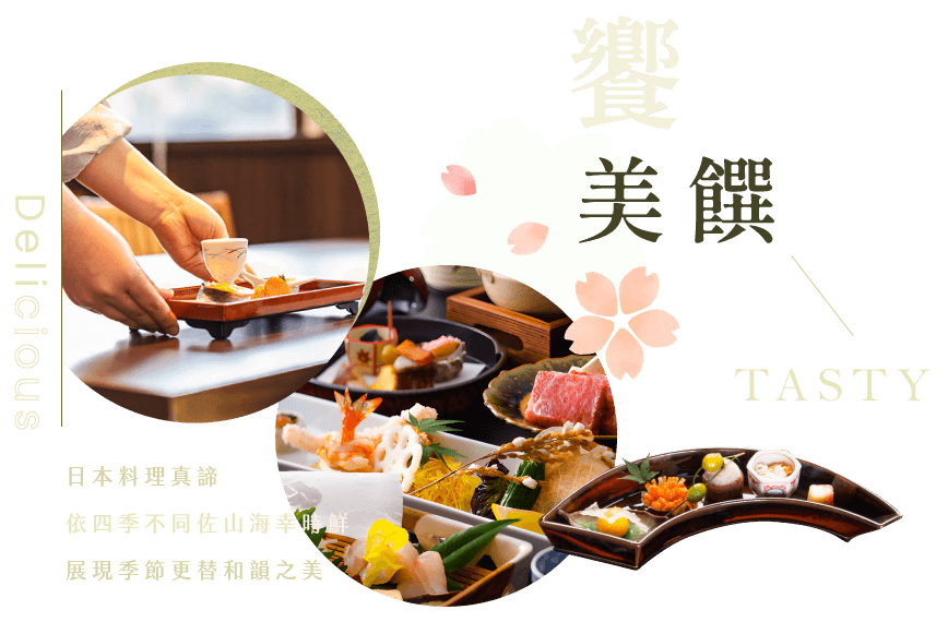 溫泉旅館會席:看著窗外四季變化;「款待的心」結合「和韻之美」,今晚,代表溫泉旅館的會席晚宴,就從第一品料理開始上演。