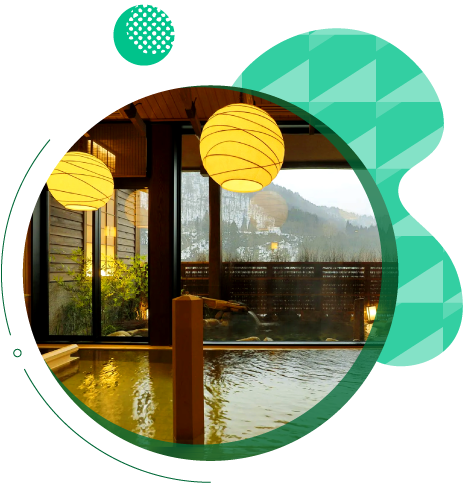 大町最大日式溫泉酒店,優質服務以及豐沛溫泉設施,給予旅客真情款待。庭園大浴場「高瀨湯」、「清音湯」,大浴場的露天風呂「山水」和「山吹」,可供旅客預約貸切的個人半露天溫泉浴池「星之湯」「月之湯」,統稱為七湯。春櫻、夏綠、秋紅、冬雪,皆可在這裡體驗最悠閒享受。