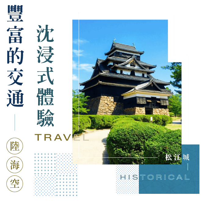 通往天際的工程奇蹟.江島大橋 ~日本牡丹之最.絶美由志園.迴遊庭園散策 ~武士領路松江城.沉浸式城郭攻頂體驗 ~出雲大社.最高位階神祇.第一大注連繩 ~神之域.出雲湯宿:住宿「出雲」可自由前往『神之濱.稻佐海濱』
