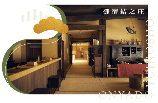 從入口處即可看到以合掌造建築設計。人與人之間聯繫是很重要的,以珍惜人與人之間緣份為主題,故取名「御宿 結の庄」。歴史と趣の薫る宿!傳統合掌造與和洋折衷設計兼容並蓄,更擁有天然溫泉「ゆるりの湯」,讓您可以在此度過寧靜放鬆的時光。
