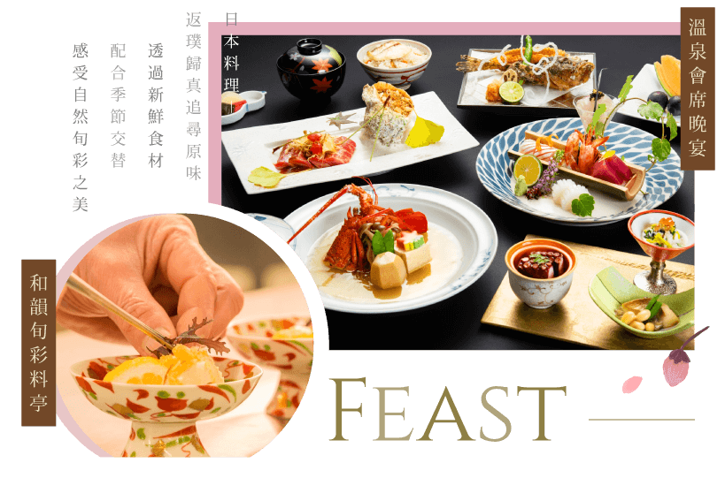 溫泉會席晚宴:一場五感之食藝,等著您用「心」來細細品宴。「款待的心」結合大自然四季旬彩,「和」韻之美就從第一品料理開始上演。