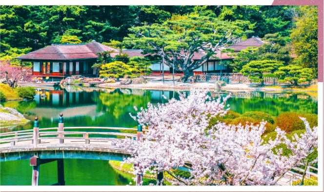 米其林三星殊榮,稱為75萬平方公尺繪畫世界,公園中種著約350棵櫻花樹,還包括宣告香川縣櫻花花期的樣本樹。以紫雲山為背景,由6個池泉、13座假山、10座亭閣巧妙佈局而成,一步一景皆有不同,其中鶴龜松、箱松、屏風松等1,400多株松樹,造就名松與櫻之絶美美景。