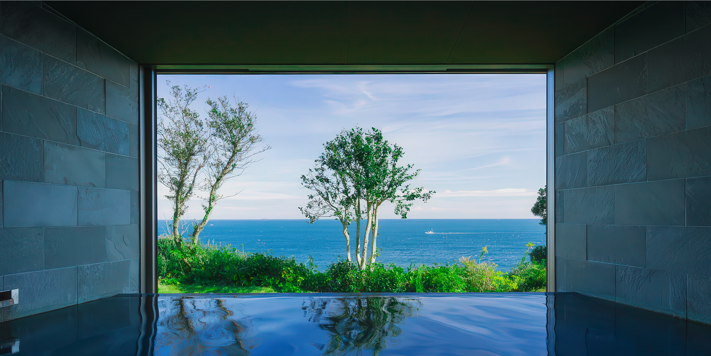 海濱豪華度假村、⼀島⼀飯店的絕佳秘境體驗、御宿坐擁壯闊海景,地球弧線⼀覽無遺。