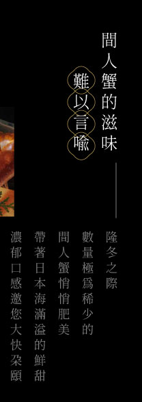間人蟹需經過約50項嚴格標準檢查,被認為是日本最高級的蟹之一。它的料理方式多樣是冬天海鮮饕客季節限定的夢幻盛宴。