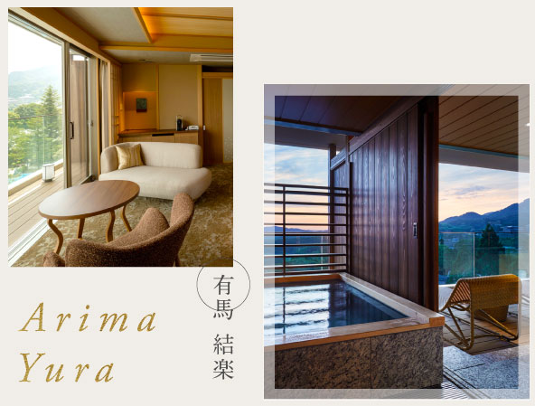 有馬 結楽:日本三大名泉之一,俯瞰有馬山脈與溫泉街景。提供高品質料理及頂級溫泉體驗。