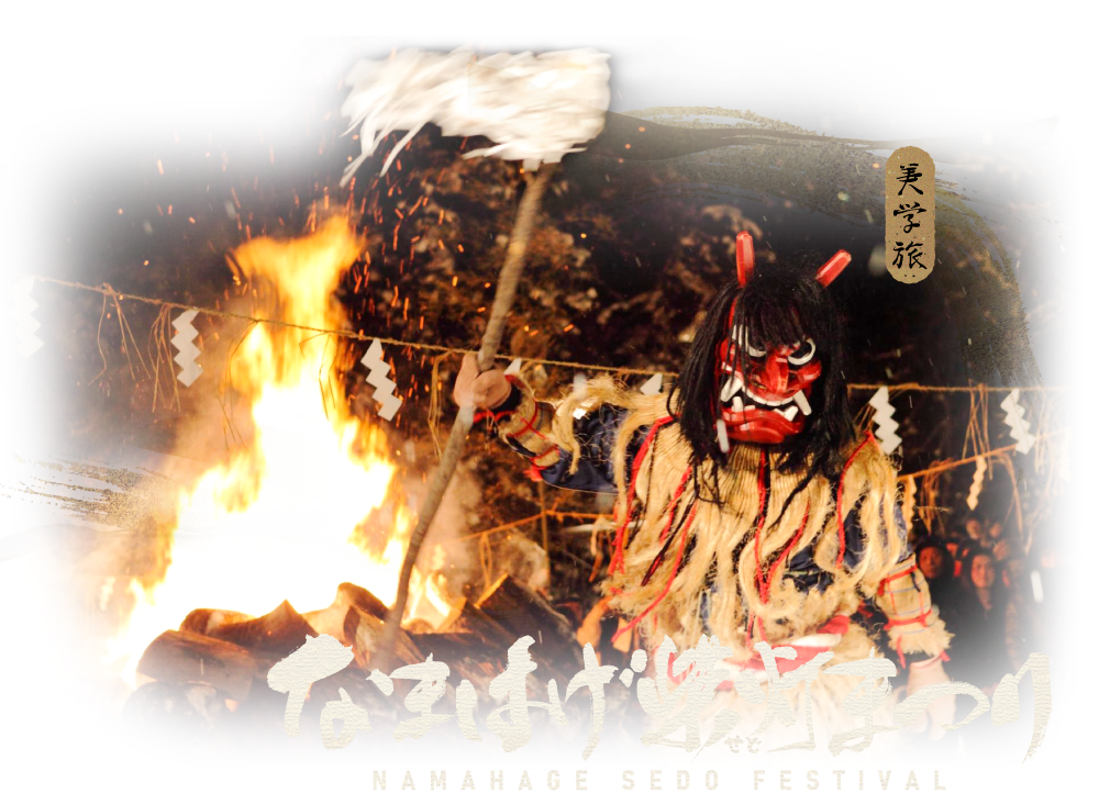 日本三大奇祭.生剝鬼柴燈祭:在夜雪紛飛中近距離觀賞,熊熊柴火映照兇猛生剝鬼的身影,吼聲迴盪,震撼心靈,親身體驗日本最原始、莊嚴而神秘的驅邪祈福儀式。